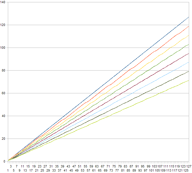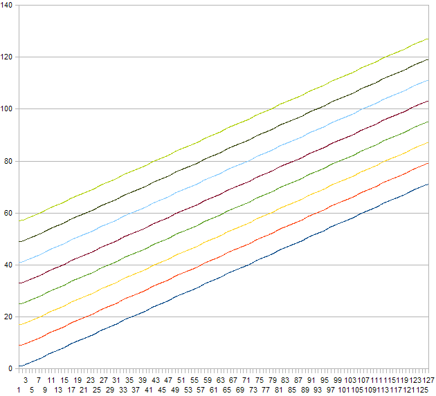 Level shift on the input. Can be set to 0, 8, 16, 24, 32, 40, 48 or 56. Here is an illustration of the effect this setting has on a MIDI note velocity depending on the applied level shift (0 - bottom line, 56 - top line) and input hit strength with a Linear curve setting and compression level 7: